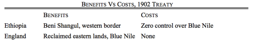 In total, there were three rounds of negotiations. The first round began in April 1899. Menelek argued that he had historical claims to the western region near Gera. Harrington swiftly denied him. The second round also failed because both countries sought to control the Beni Shangul area. Menelek believed Beni Shangul held immense gold reserves and was located near the Blue Nile. Despite these hiccups, Harrington and Menelek considered it their best interest to restart working on a treaty, making concessions along the way.96 After more weeks of negotiations, Harrington received a revised draft. In it, Menelek “altered the frontier south of Melile to his advantage [and] he had inserted a clause about Tsana and the Blue Nile which absolutely knocks the bottom out of the exchange of notes on this subject…”97 Displeased that Menelek was a “slippery customer,” Harrington commented to Ilg, “if he does not settle the frontier within [a short time]…it will be a matter for serious consideration whether we ought not to consider the question of delivering an ultimatum as to what we consider Egyptian territory, and then settle the question once for all.”98 Menelek must have “realized he had reached the limits of Harrington’s patience,” because a week later he conceded his jurisdiction over the Blue Nile.99 In May of 1902, treaty papers were drawn up and signed. While Menelek received expanded territory that included Beni Shangul, England “protected her interests in the Nile Valley and received guarantees concerning the Blue Nile and Lake Tana.”100
