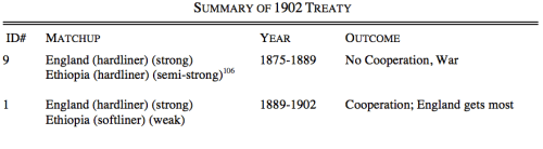 In the second term, England’s status as a strong hardliner remained. Its preferences also were the same. Ethiopia, however, changed from a semi-strong hardliner to a semi-weak softliner. While its military strength had remained relatively strong, the leadership altered from the hawkish Yohannes regime to the pragmatic, cautious Menelek government. As a result, its preferences were: (1) receive many perks, concede little in return; (2a) concede most issues; (2b) return to the status quo; and (3) assume hostile relations. Because Ethiopia was a “semi-weak” state, it wavered from 2a to 2b as its most outspoken preference. Since they could possibly defend against another English invasion, Ethiopia decided to push against England until the threat of war was imminent. In the end, both states followed England’s first preference and Ethiopia’s 2a preference. The treaty was signed and England received most of the proposed benefits. While England forfeited small tracts of land, Ethiopia lost an extremely valuable resource, the Nile. From this second interval, the variation in the government orientation changed Ethiopia’s preferences, which allowed both states to come to an agreement.